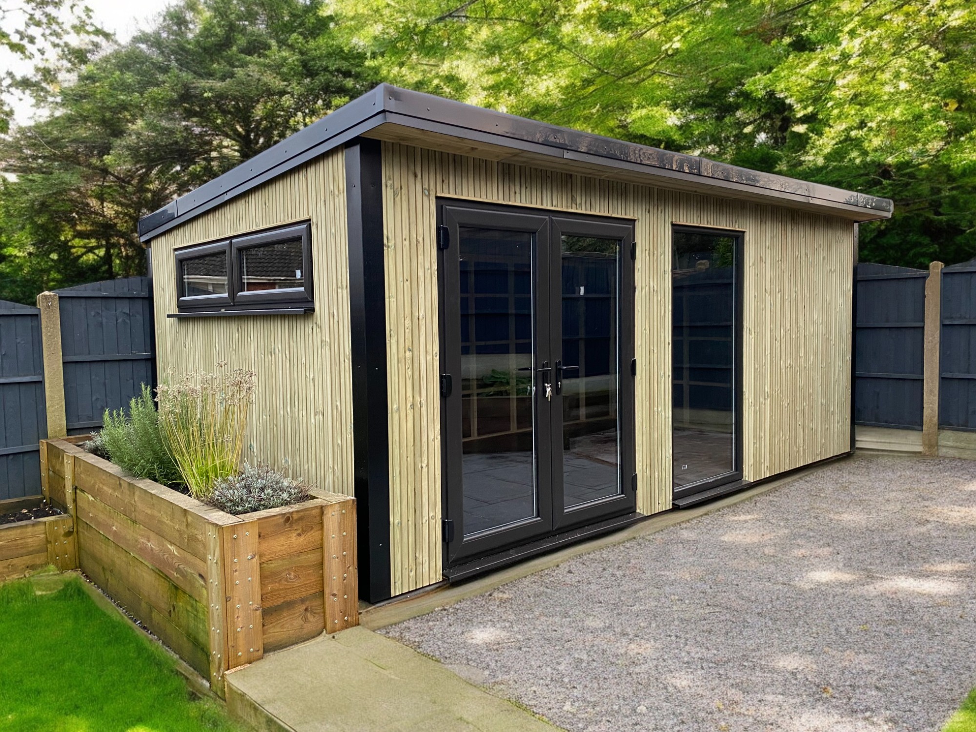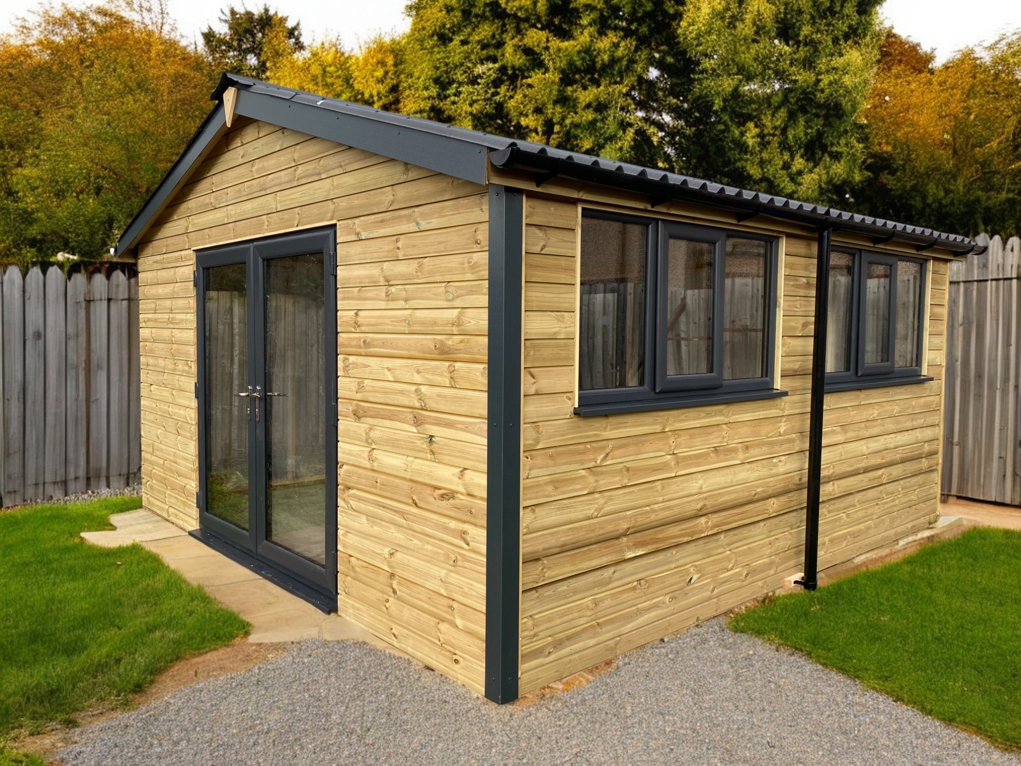 Boasting a defined sheltered frontage with enclosed sides and roof. A real statement garden building.